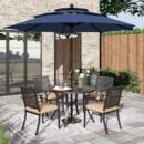 Coming also with an patio umbrella without umbrella base, our 5-piece dining set delivers an updated take on modern style that highlights fine details and unique patterns in special year 2022. Designed for comfortable and convenient, the set is constructed from well-made sturdy e-coated steel and is weather-resistant. The coordinating dining chairs transmit a feeling of relaxing for family and friends to gather and celebrate. In addition, with stylish and retro armrest and stackable function are two highlight of distinctive design chairs.