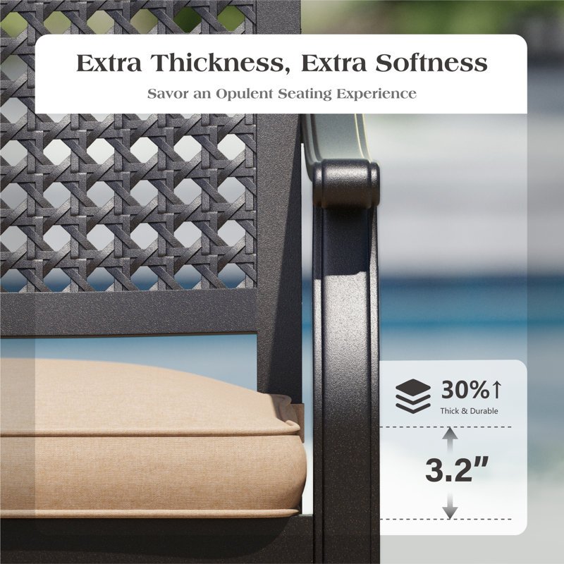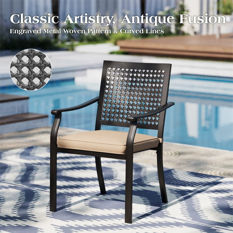 - Heavy duty e-coated frame: With upgrade materials and a much stronger and wider seat, this is new upgrade series of outdoor dining chairs. The e-coating surface will protect the metal frame from damp air! An extra thickened metal frame ensures the outdoor dining chair’s longevity! Particularly materials of outdoor dining chairs’ material such as steel frames that chairs have long-term durability.