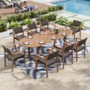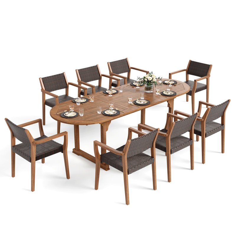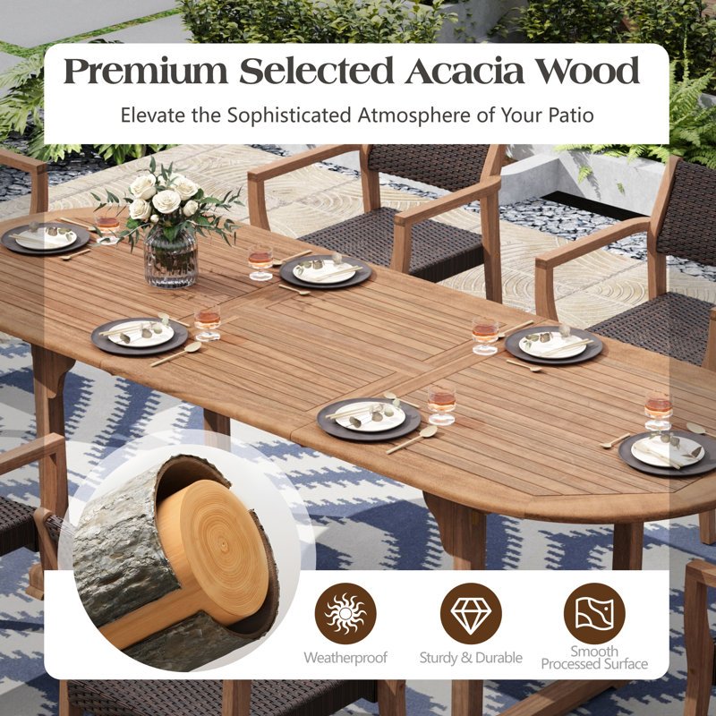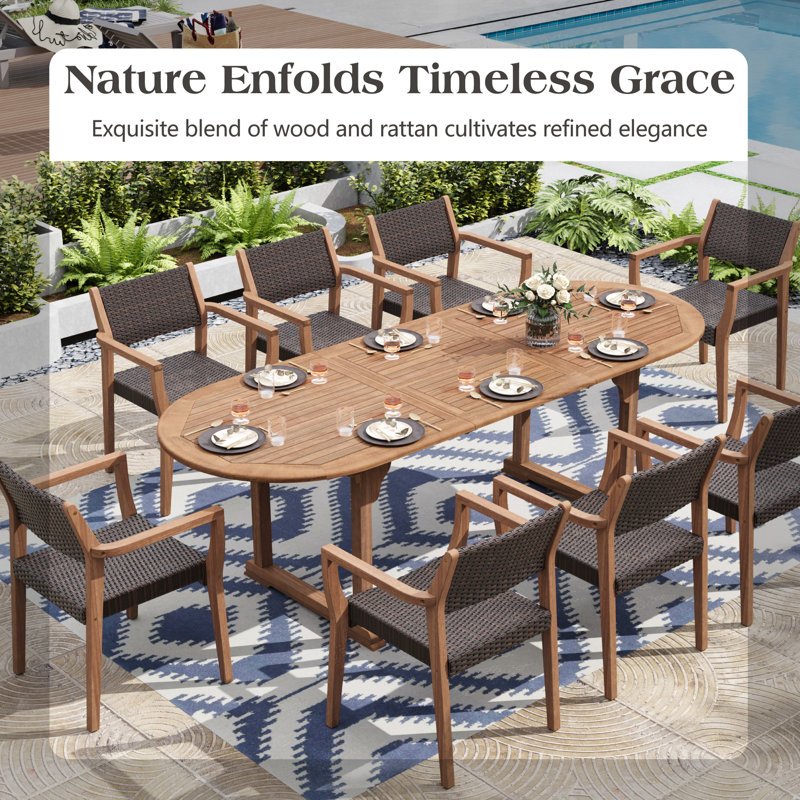 Complete your outdoor oasis with our exquisite dining set, featuring an elegant extendable acacia wood table and eight handcrafted rattan chairs. The oval tabletop boasts graceful curves that complement its rich wood grain finish, while the innovative extension mechanism (70.9″-94.5″) adapts to any gathering size. Each chair combines sturdy acacia frames with premium woven rattan, offering both durability and breathable comfort. Designed for outdoor living, this set features weather-resistant materials that withstand sun and rain while maintaining its sophisticated appeal. The thoughtful slatted table design ensures quick water drainage, making it ideal for poolside dinners or garden parties.